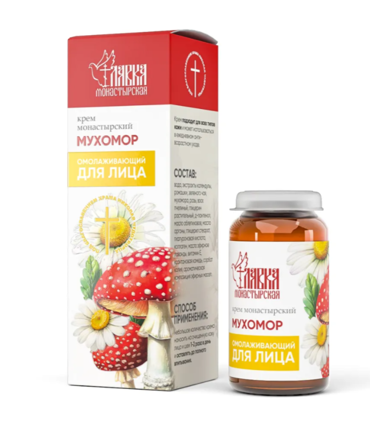 Крем создан по рецептам монастырей на основе мухомора и комплекса целебных растений, издревле применяемых для омоложения кожи.