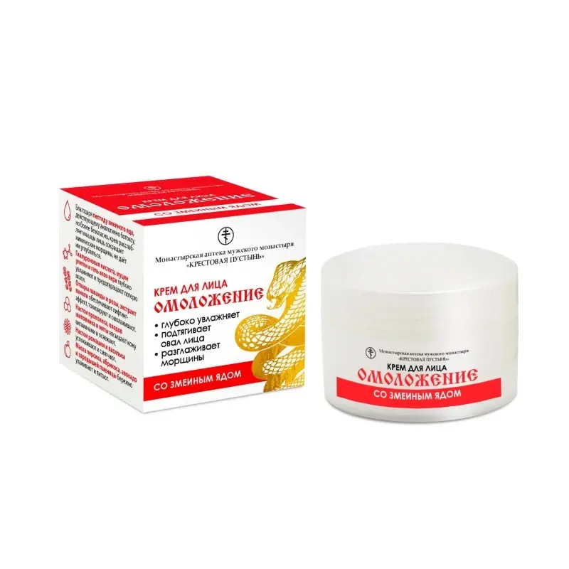 Крем для лица со змеиным ядом «Омоложение» быстро и эффективно подтягивает овал лица, устраняет мелкие морщинки и не даёт появляться новым. Благодаря пептиду змеиного яда, действующему аналогично ботоксу, но более безопасно, крем расслаб- ляет мышцы лица, сокращает мимические морщины, не даёт им углубляться. Гиалуроновая кислота, муцин улитки и гель алоэ вера глубоко увлажняют и предотвращают потерю влаги. Отвары лаванды и розы, экстракт ванили обеспечивают лифтинг- эффект, тонизируют и омолаживают. Настои прополиса, плодов шиповника и мяты насыщают кожу витаминами и освежают. Настои ромашки и василька успокаивают и смягчают. Масла персика, абрикоса, авокадо и зародышей пшеницы бережно ухаживают и питают.