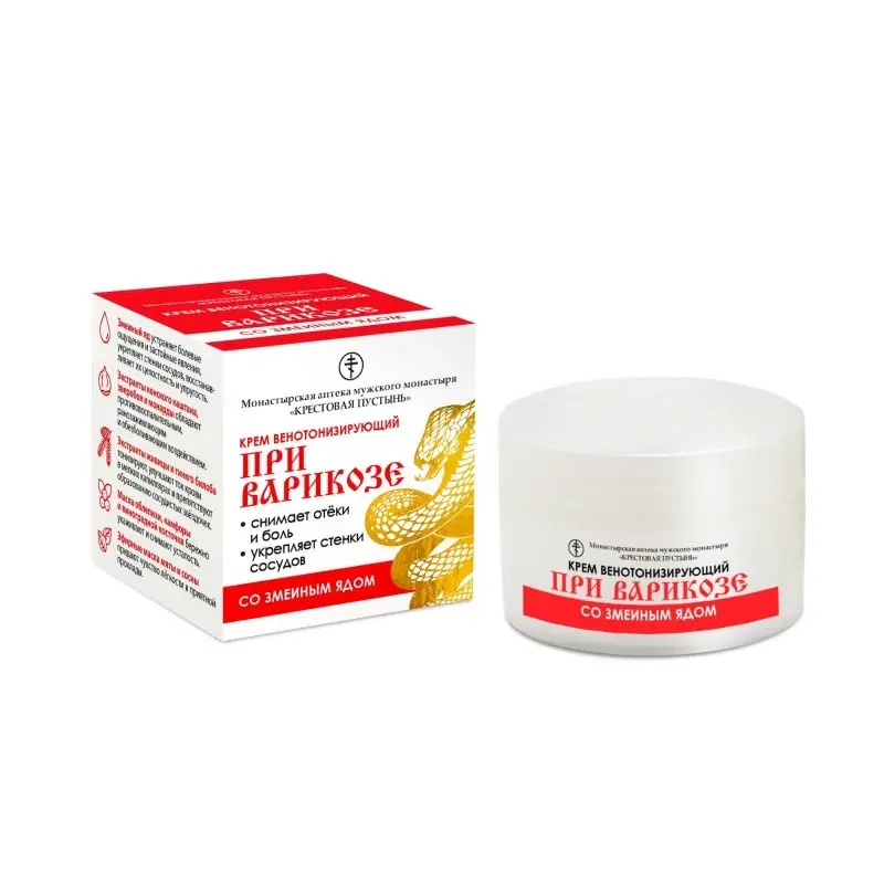 Крем «При варикозе» со змеиным ядом оказывает мощное регенерирующее воздействие, ускоряет кровообращение, нормализует циркуляцию крови, снимает отёки, чувство жжения и тяжести в ногах. Змеиный яд устраняет болевые ощущения и застойные явления, укрепляет стенки сосудов, восстанав- ливает их целостность и упругость. Экстракты конского каштана, зверобоя и монарды обладают противовоспалительным, ранозаживляющим и обезболивающим воздействием. Экстракты живицы и гинкго билоба тонизируют, улучшают ток крови в мелких капиллярах и препятствуют образованию сосудистых звёздочек. Масла облепихи, камфоры и виноградной косточки бережно ухаживают и снимают усталость. Эфирные масла мяты и сосны придают чувство лёгкости и приятной прохлады.