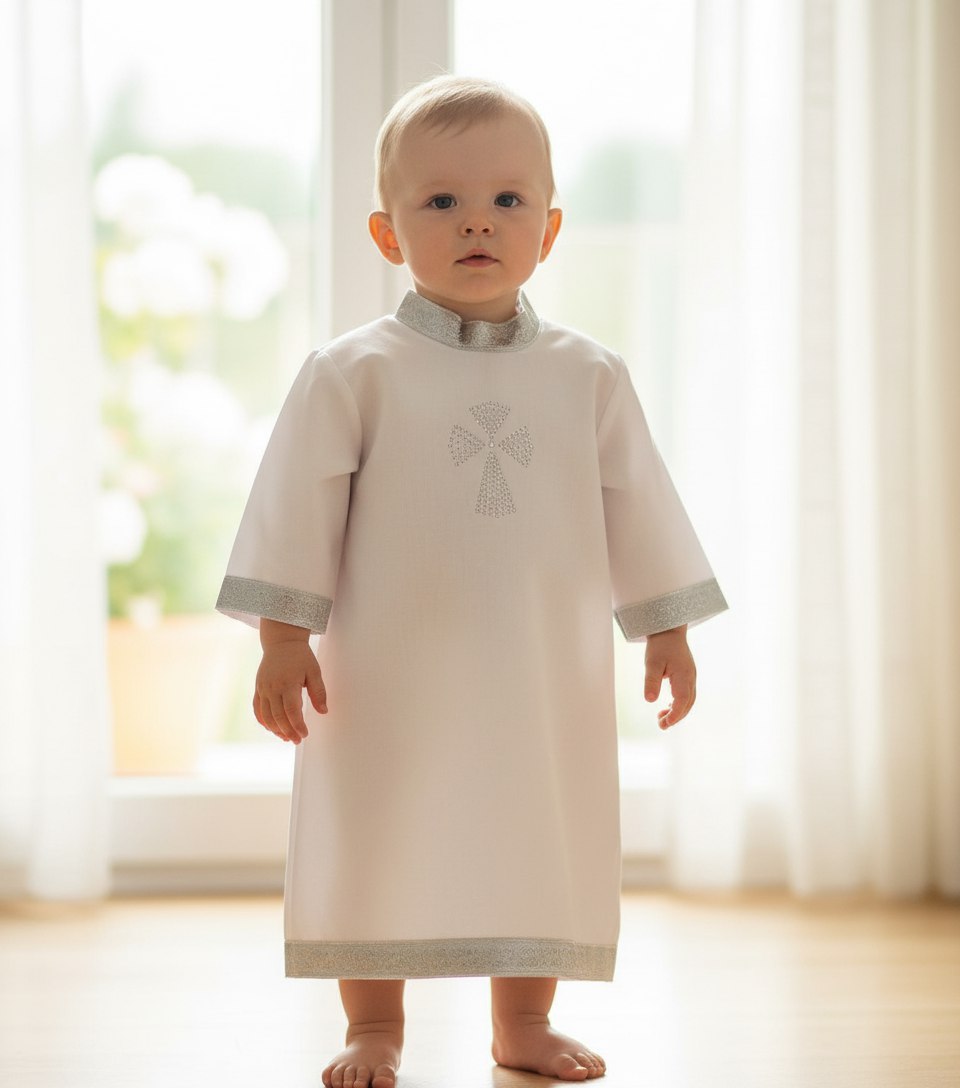 Сияние Вечности: Центральный элемент – нежная аппликация "Крестик", инкрустированная искрящимися стразами. Вы можете выбрать благородную серебряную или теплую золотую отделку тесьмой по краю, создавая гармоничный и торжественный образ вашего ребенка.