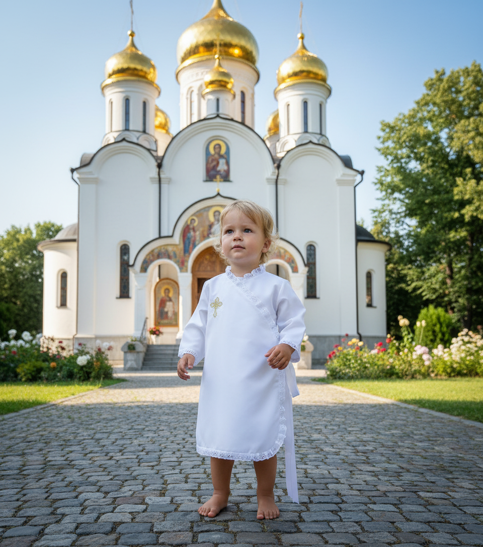 Эта изысканная рубашка — не просто наряд, а символ чистоты и особой миссии. Идеальный выбор для Таинства Крещения, будь то купель или освященный источник.