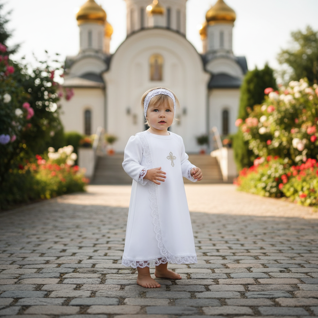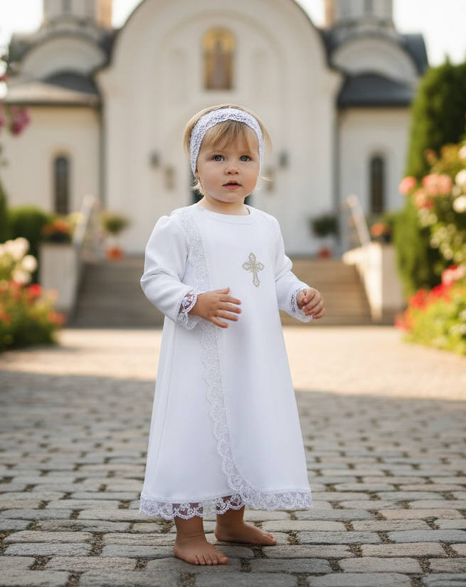 набор для девочки состоит из двух предметов: * рубашка из трикотажа, украшена кружевом. На груди вышивка, застежка на плече * чепчик (косыночка) из трикотажа Цвет: белый или кремовый Длина от плеча до низа: 49см