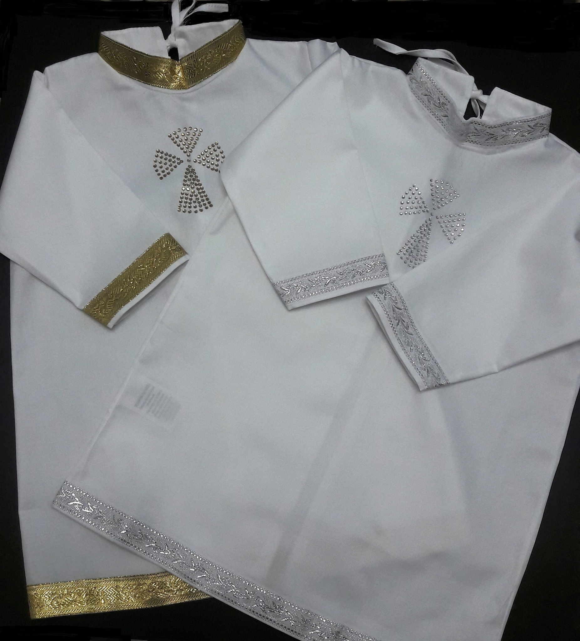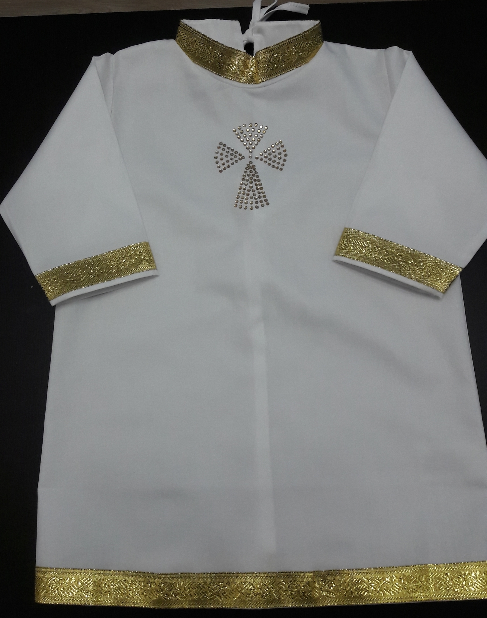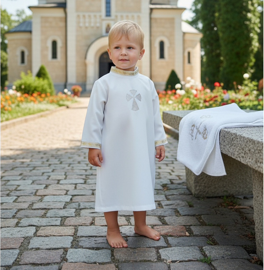 Сияние Вечности: Центральный элемент – нежная аппликация "Крестик", инкрустированная искрящимися стразами. Вы можете выбрать благородную серебряную или теплую золотую отделку тесьмой по краю, создавая гармоничный и торжественный образ вашего ребенка.