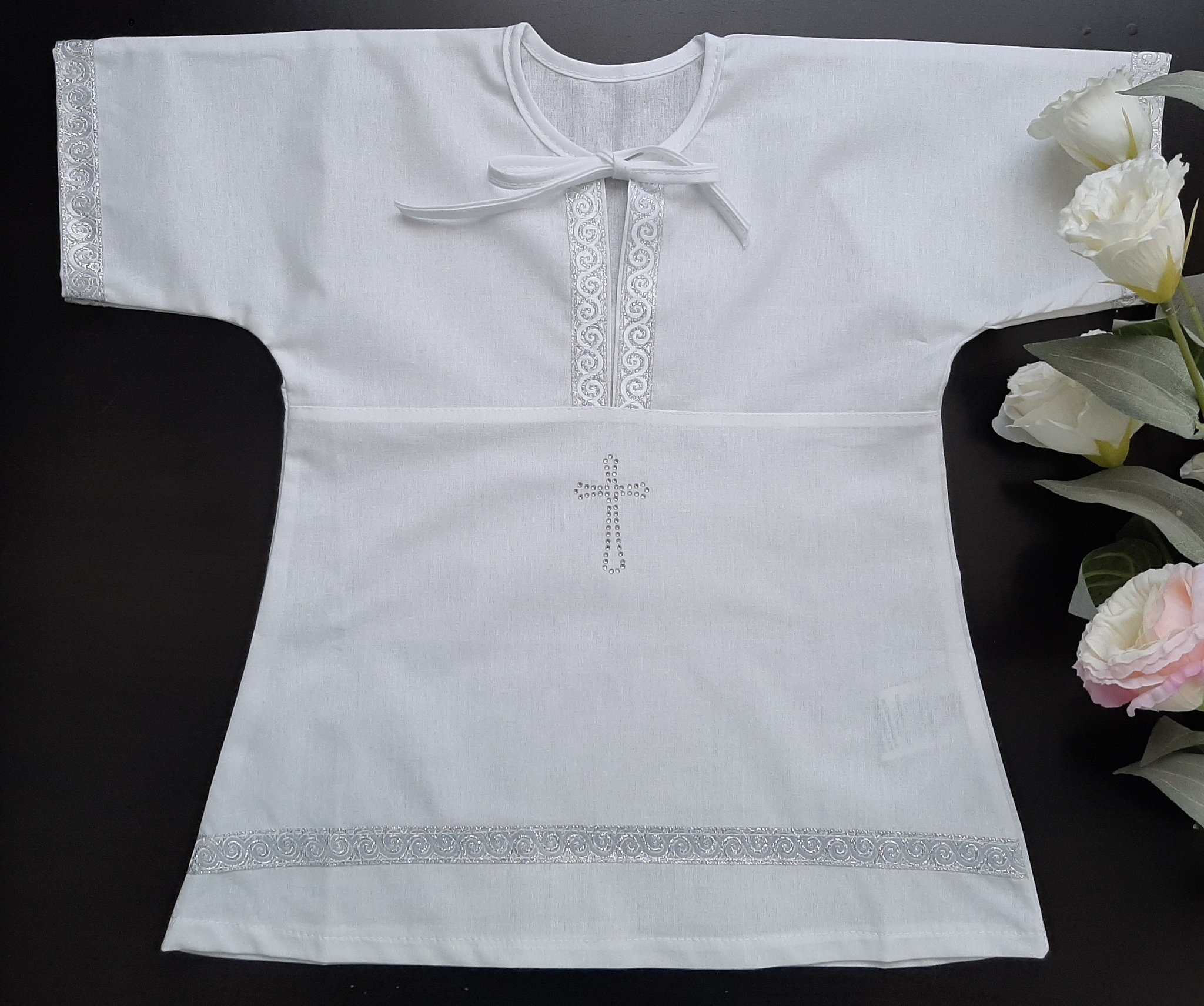 ✨ Роскошные детали, говорящие о главном:Рубашка изысканно декорирована блестящей золотой или серебряной тесьмой и трогательной аппликацией "Крестик" из сияющих страз, которая добавит сияния в этот святой день.